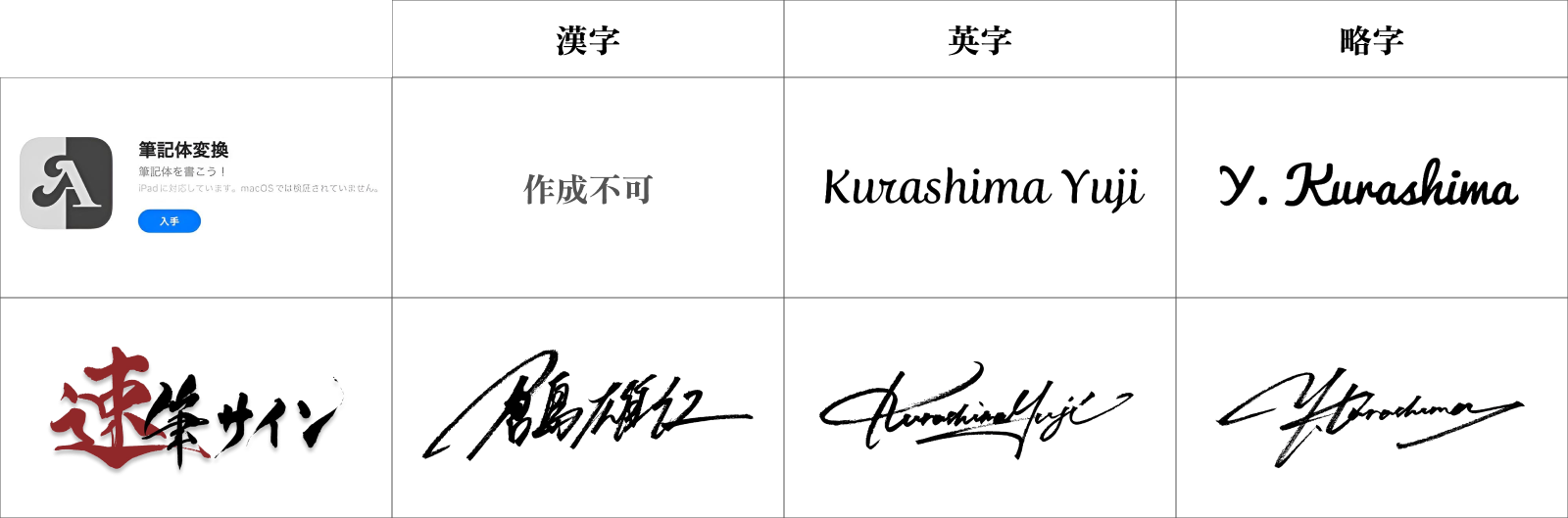 また、このようなサービスは英字のみに対応しているため、利用機会の多い漢字サインは作ることができません。